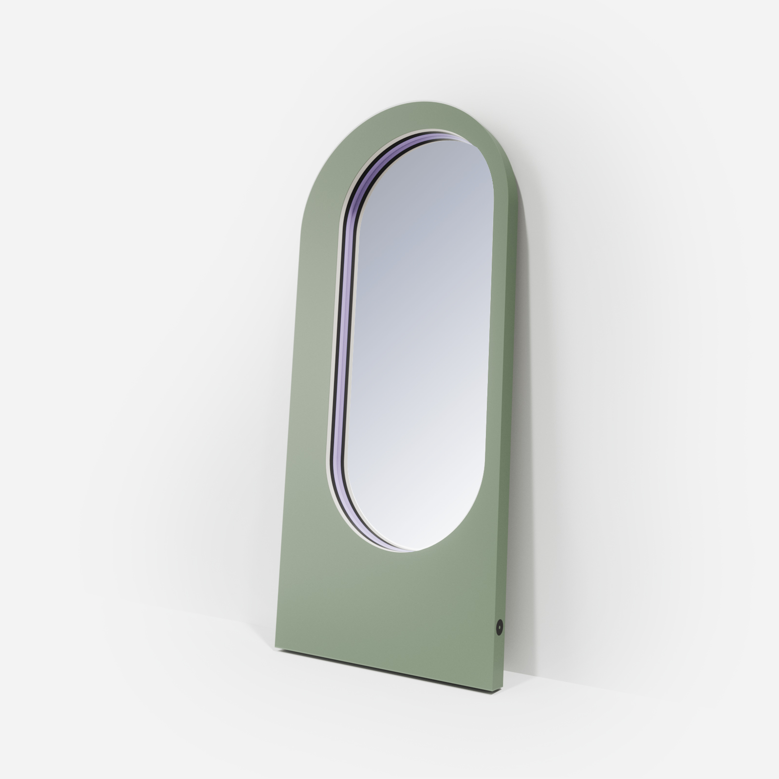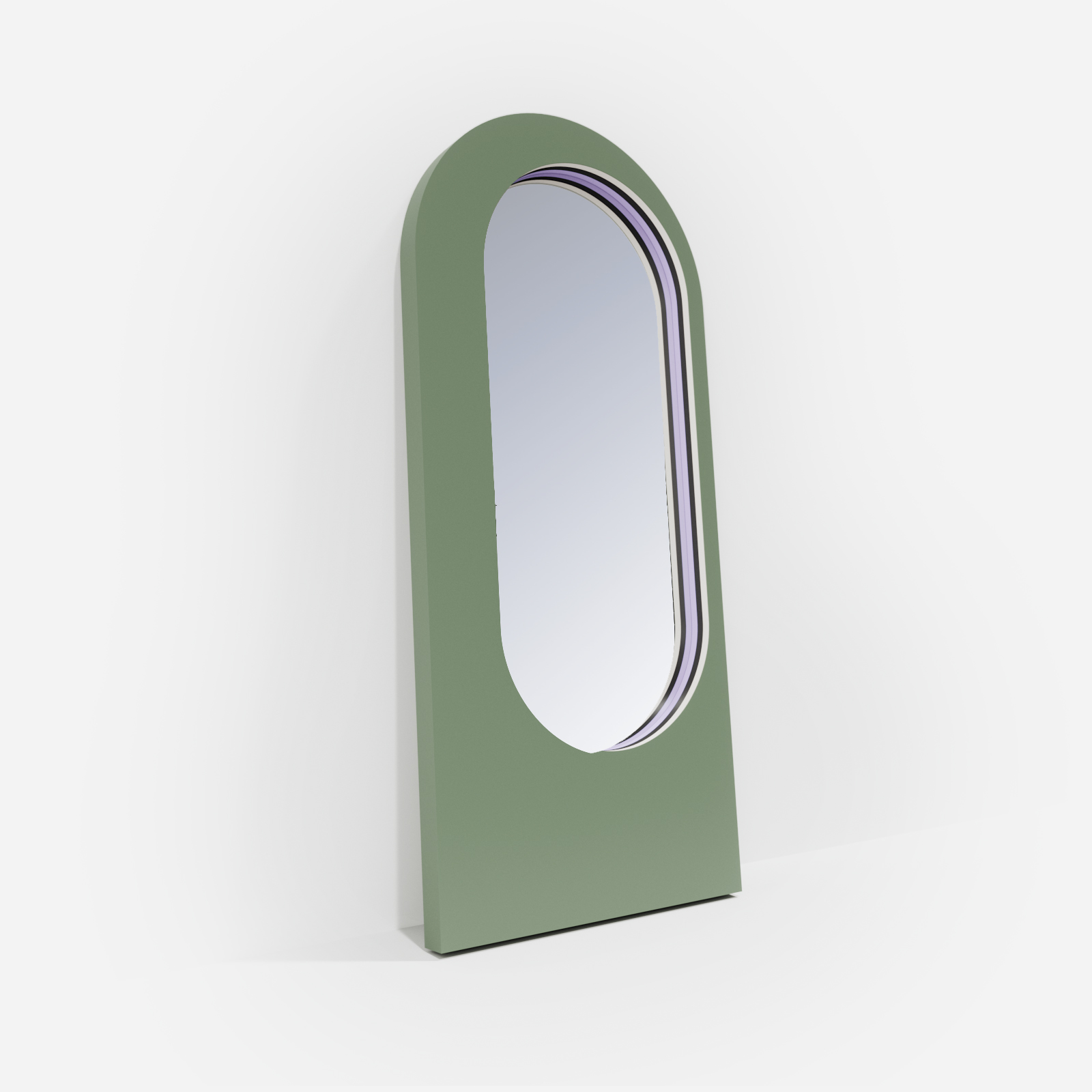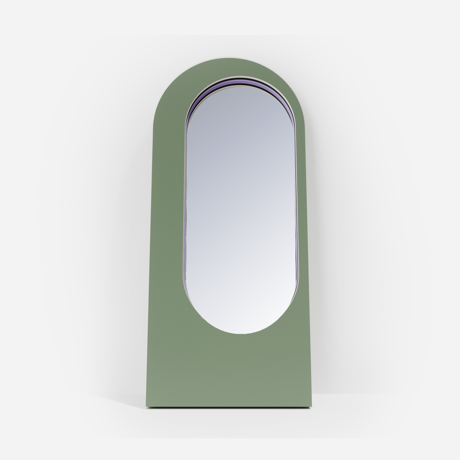 The mirror is a standing piece of furniture, leaning against the wall at an angle.