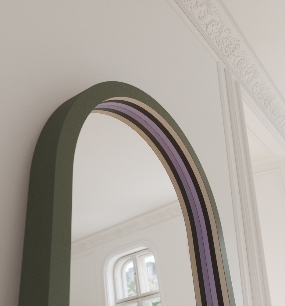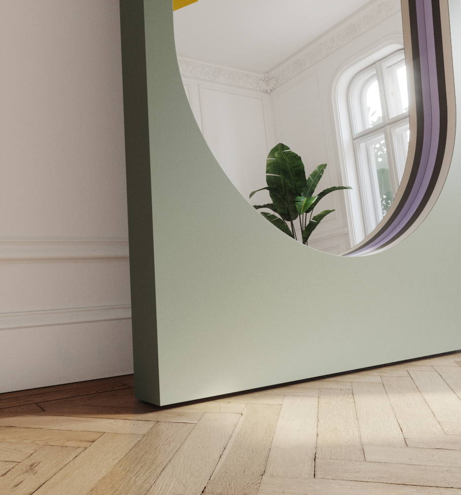hall. It will work in both large and small spaces – it will brighten them by adding light. Its modern shape is a combination of the minimalist functionalism of the Bauhaus style and the postmodern, energetic aesthetics of the Memphis Group. The unique form is created by a geometric, spatial frame, finished with a detail in the form of graphic stripes in three colors that surprise, add energy and enhance the depth of the mirror. The colors we have chosen will give the interior bold