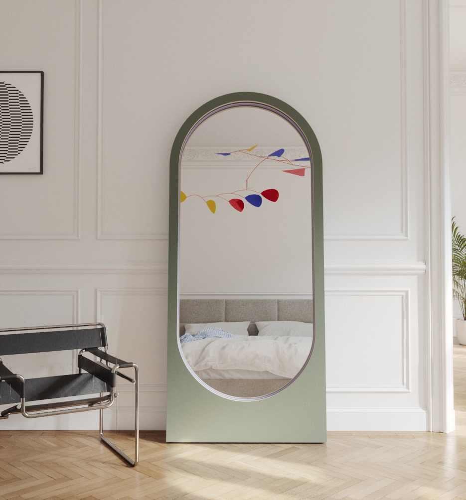 The mirror is a standing piece of furniture, leaning against the wall at an angle.
